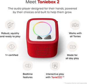 Toniebox 2 is the kid-powered audio player with even more ways to play, designed for ages 1-9+. Kids can dive into favorite stories and songs with an ever-growing crew of Tonie characters, just by popping one on the Toniebox. Or, unlock interactive games, quizzes, and challenges where they take the lead with Tonieplay. And that’s not all - build healthy sleep habits with clever new bedtime features. With no screens or ads, kids can play safely and independently in a whole new way.