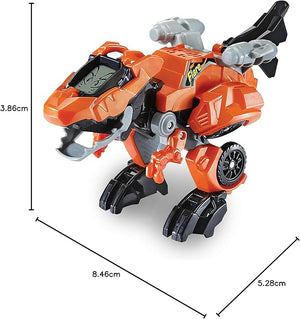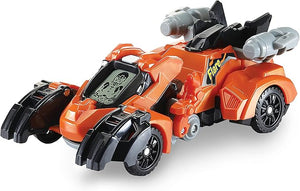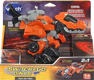 Introducing Flare the T-Rex by VTech®! This wild Switch & Go Dino is an exciting 2-in-1 toy which switches between a fierce T-Rex and a fast car! See cool dino eye and driver animations on the LCD screen! Tilt Flare's head back, or press on the bumper to see Flare shine a cool fire light projection! Doing so will also trigger exciting car and dinosaur sound effects, fun phrases and facts about the T-Rex! Flare will light up with the responses, adding to the excitement! Hear even more great sound effects when Flare moves and switches between dinosaur and car modes! 2-in-1 T-Rex which switches into a fast car! Hear cool dinosaur facts, fun phrases and exciting sound effects! 3 to 8 Years.